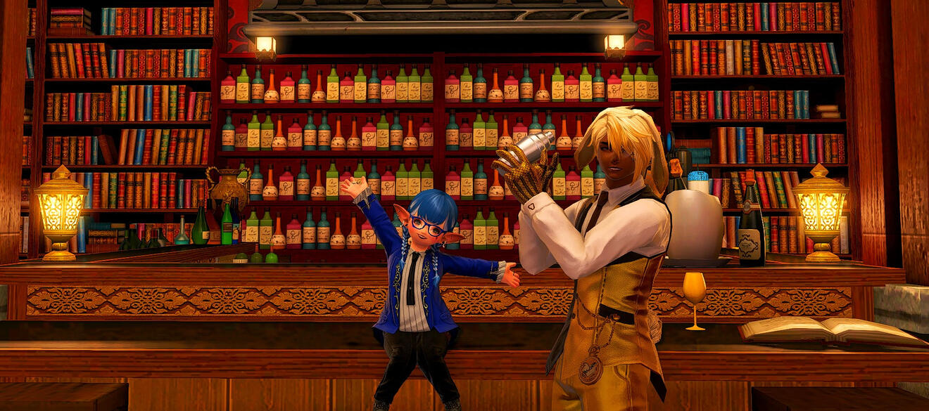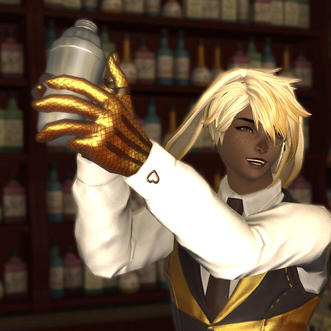 "Howdy folks, welcome to the Nightly, where the night is yours! Be it finely crafted cocktails or engaging conversation, we've got you covered!"A good listener and too smart-mouthed for her own good, Beena is devoted to fixing drinks to cure what ails you and making sure her boss stays out of trouble. Bring her a bottle of Kugane whiskey if you really want to get on her good side.
